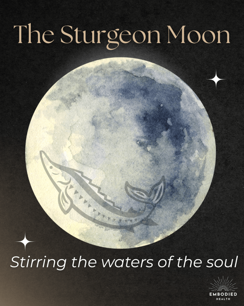 The Sturgeon Moon offers a mirror: What old emotional patterns have settled in your depths? What habits, relationships, or inner narratives are ready to be stirred up and transformed? What experiences have you not yet processed, that you are now ready to release and move forward from?